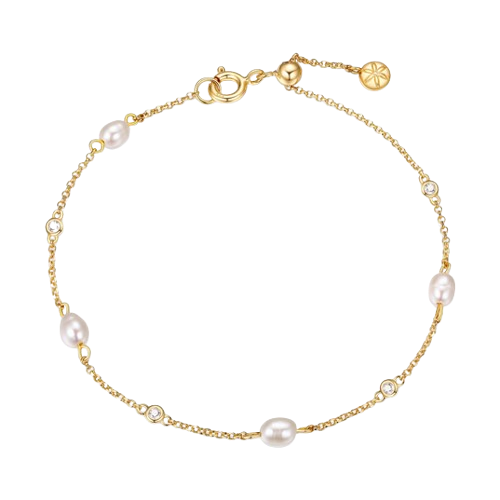 4mm shell pearl station necklace in sterling silver with 18K gold plating. 15+3".