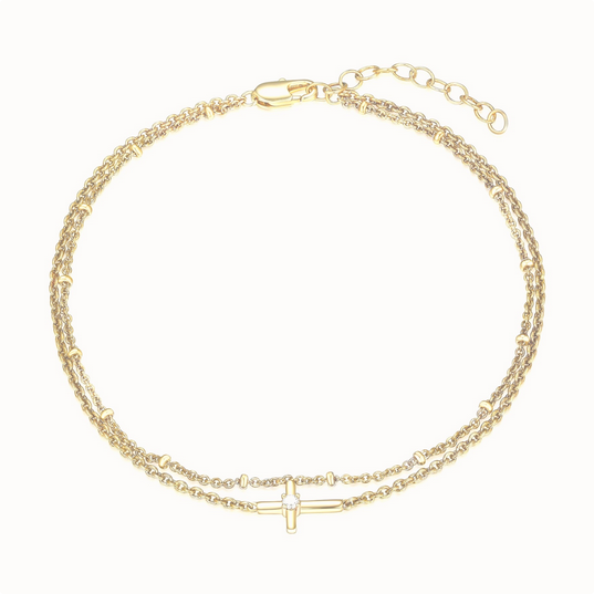 Diamondlite CZ double chain sideways cross anklet in sterling silver with 18K gold plating.