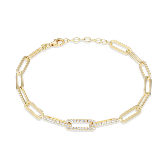 Diamondlite CZ paperclip link chain bracelet with pave CZ accents in sterling silver and 18K gold plating.
