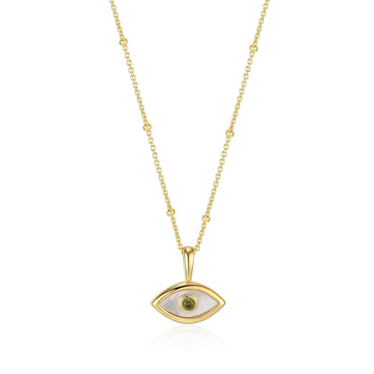MOTHER OF PEARL AND GENUINE BLUE TOPAZ EVIL EYE PENDANT IN STERLING SILVER WITH 18K GOLD PLATING.